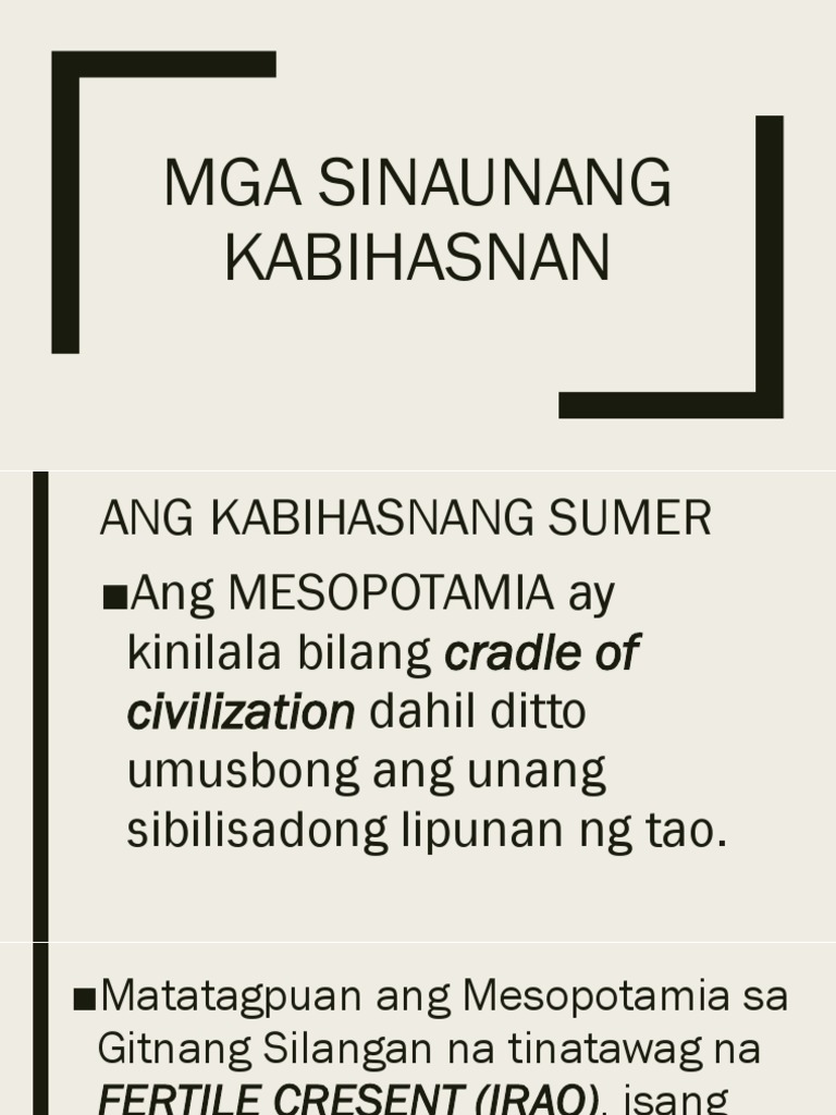 Nasusuri ang mga S inaunang K abihasnan ng Egypt Mesopotamia India at China batay sa P olitika E konomiya K ultura R elihiyon P aniniwala at L ipunan Balik-Aral. Mga sinaunang kabihasnan sa asya Sinasabing ang mga Sumerian ang unang sibilisasyon ng Mesopotamia.