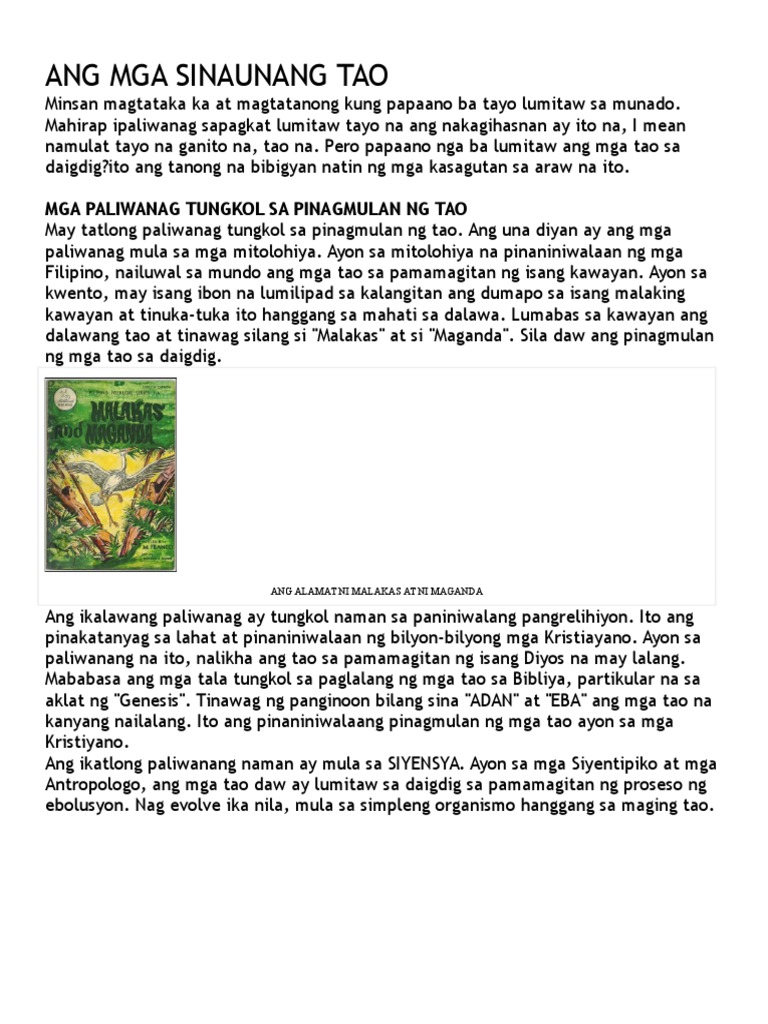 Ayon sa mga ebidensiyang pang- agham ang mga anatomikal na modernong tao ay nagebolb sa Silangang Aprika noong mga 200000 taong nakakalipas mula sa Homo heidelbergensis bago kumalat sa ibat ibang panig ng mundo. Ang Pinagmulan Ng Tao Ayon Sa Mga Relihiyon. Ilista ang mga pakinabang ng tao sa sumusunod na mga hayop.