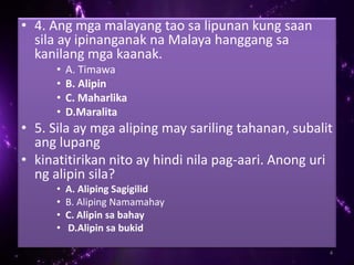 Ang isang katutubo ay nagiging alipin sa ibat- ibang kadahilanan. Tamang sagot sa tanong. Tatlong Uri ng AlipinTumataban-araw-araw na nagsisilbi sa amo Ayuey-tatlong beses sa isang linggo.